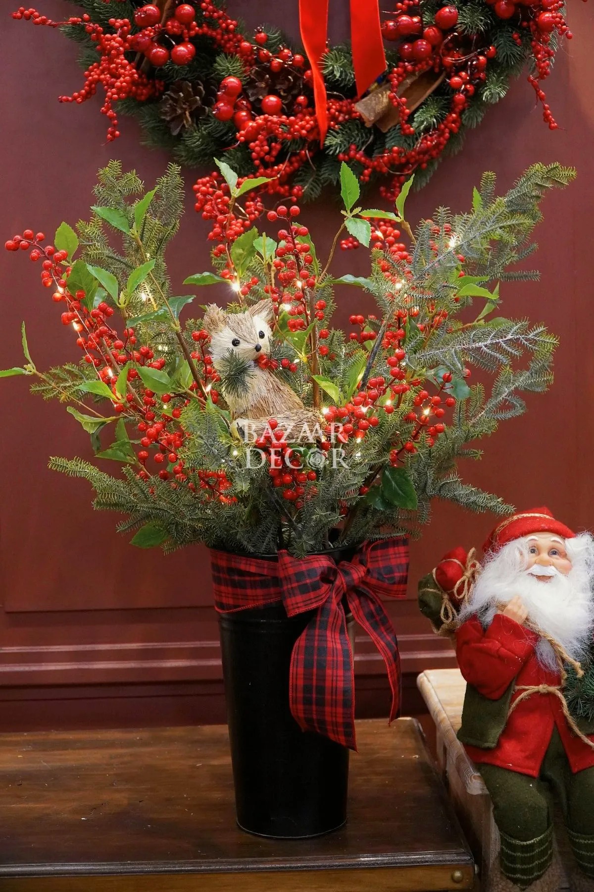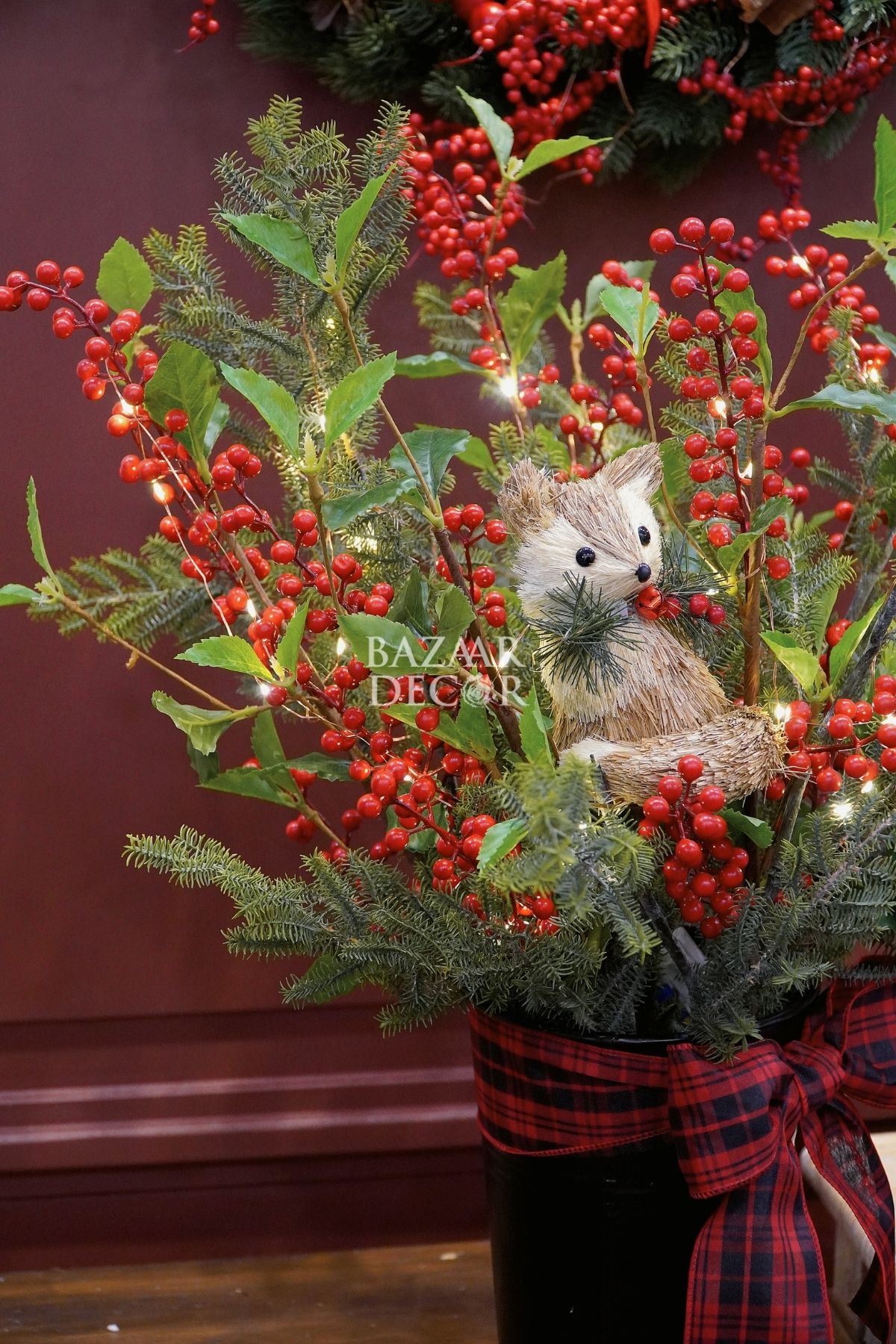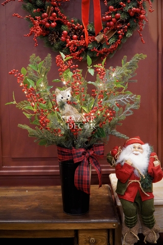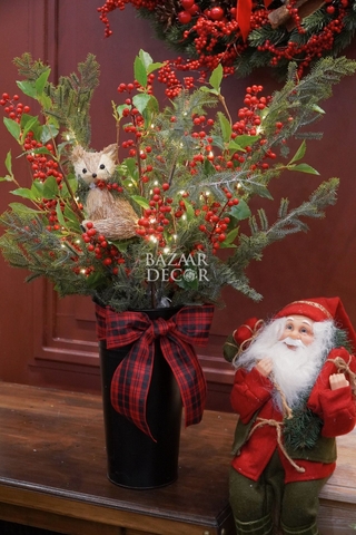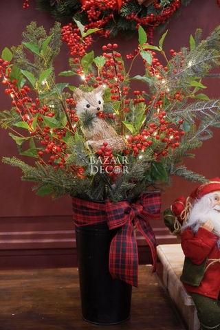 - Khay sóc và bình sóc cắm sẵn: xinh xắn nổi bật với cành thông và quả berry đỏ rực đầy sức sống, nổi bật là chú sóc bằng chất liệu mây tre đan tự nhiên tạo nên khung cảnh lễ hội ấm áp gần gũi đậm chất Vintage.