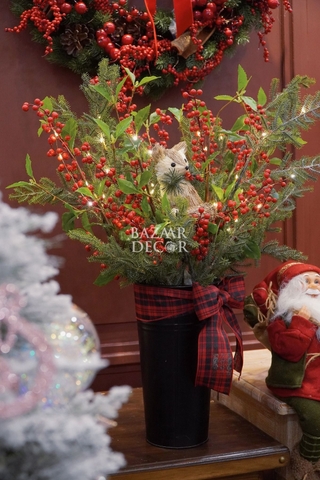- Dây thông táo & trạng nguyên: màu đỏ rực rỡ của trạng nguyên, táo các loại berry trên nền lá thông mang lại không khí lễ hội tươi vui sinh động thích hợp trang trí không gian cửa, cửa sổ, lan can hoặc bàn ăn.