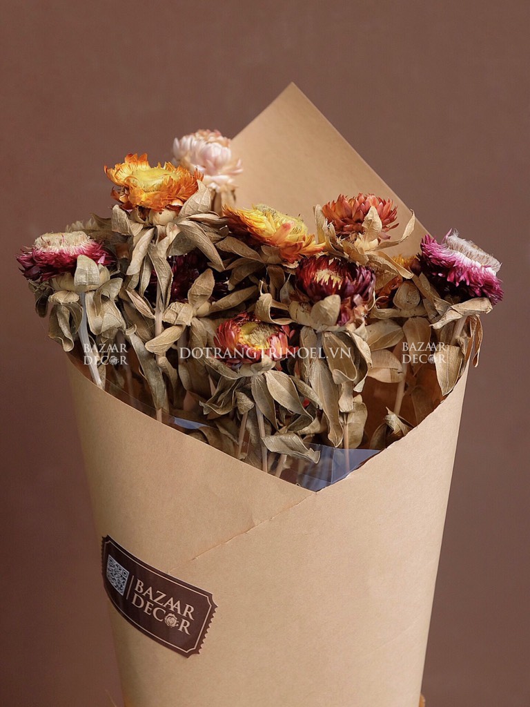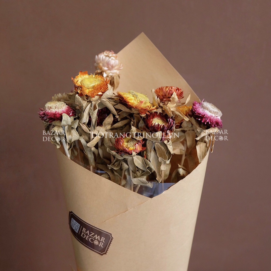 Hoa cúc bất tử sấy khô mang hình dáng đặc trưng với những cánh hoa nhỏ xinh và màu sắc tươi sáng, hình dáng hoàn hảo, tạo nên sự hài hòa và tinh tế cho không gian trang trí.