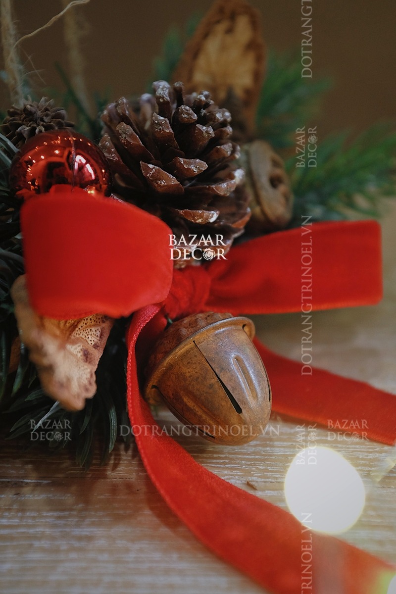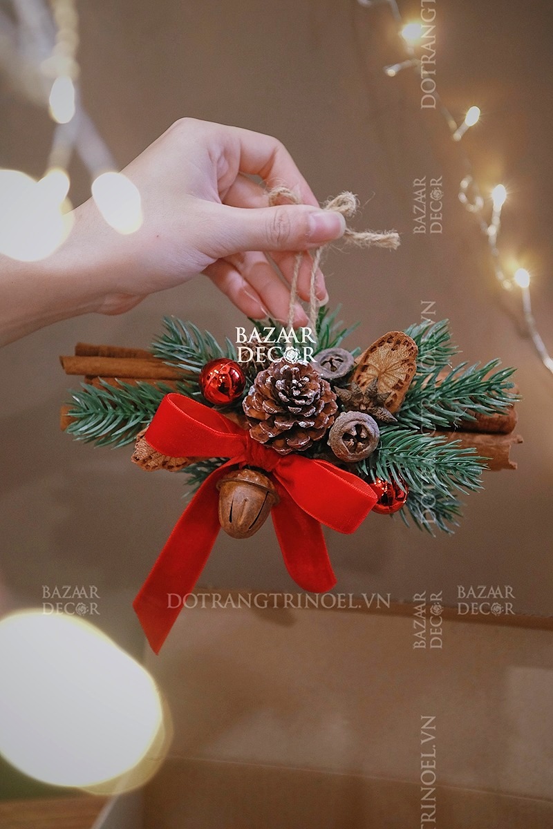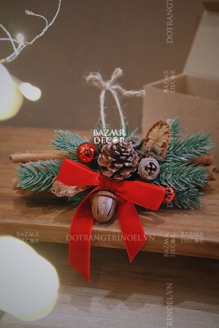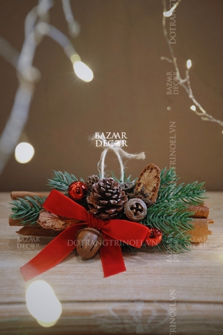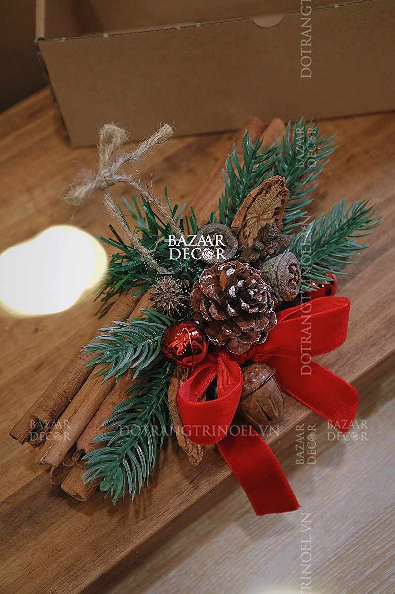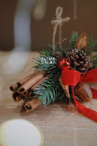 Hãng: BAZA✨ Mô tả: Những thanh quế thơm buộc khéo léo thành bó nhỏ, điểm xuyết quả thông, châu mini và phụ kiện khô xinh xắn. Nơ đỏ rực rỡ cùng dây thừng mộc mạc tạo nên nét duyên vừa giản dị vừa ấm áp.