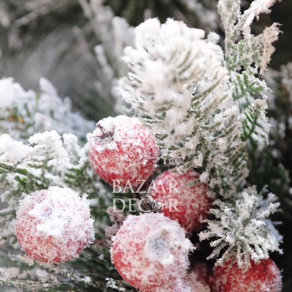 Cây thông chất liệu lá cao cấp phủ tuyết ở đầu lá, đẹp tự nhiên, có thể có cành trái berry đỏ hoặc không tùy theo đợt hàng. Gồm chân sắt, không bao gồm dây đèn.