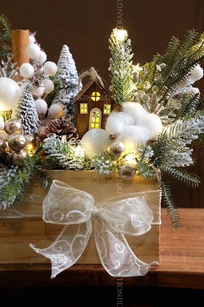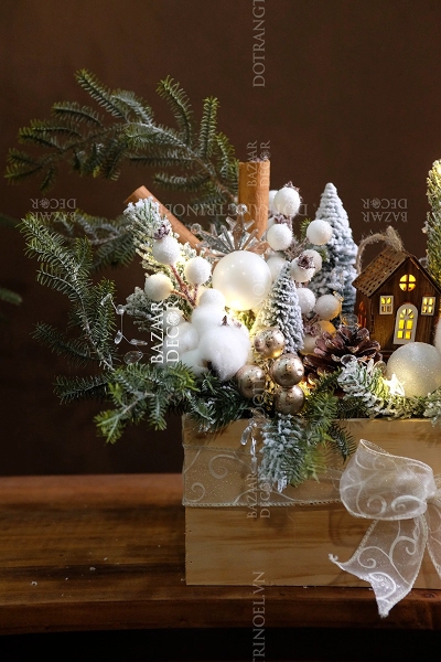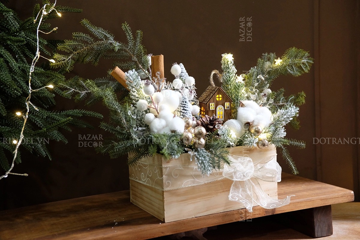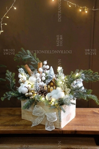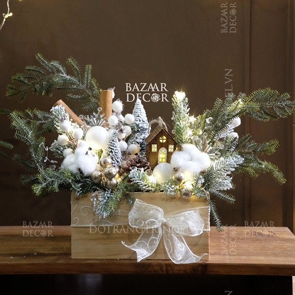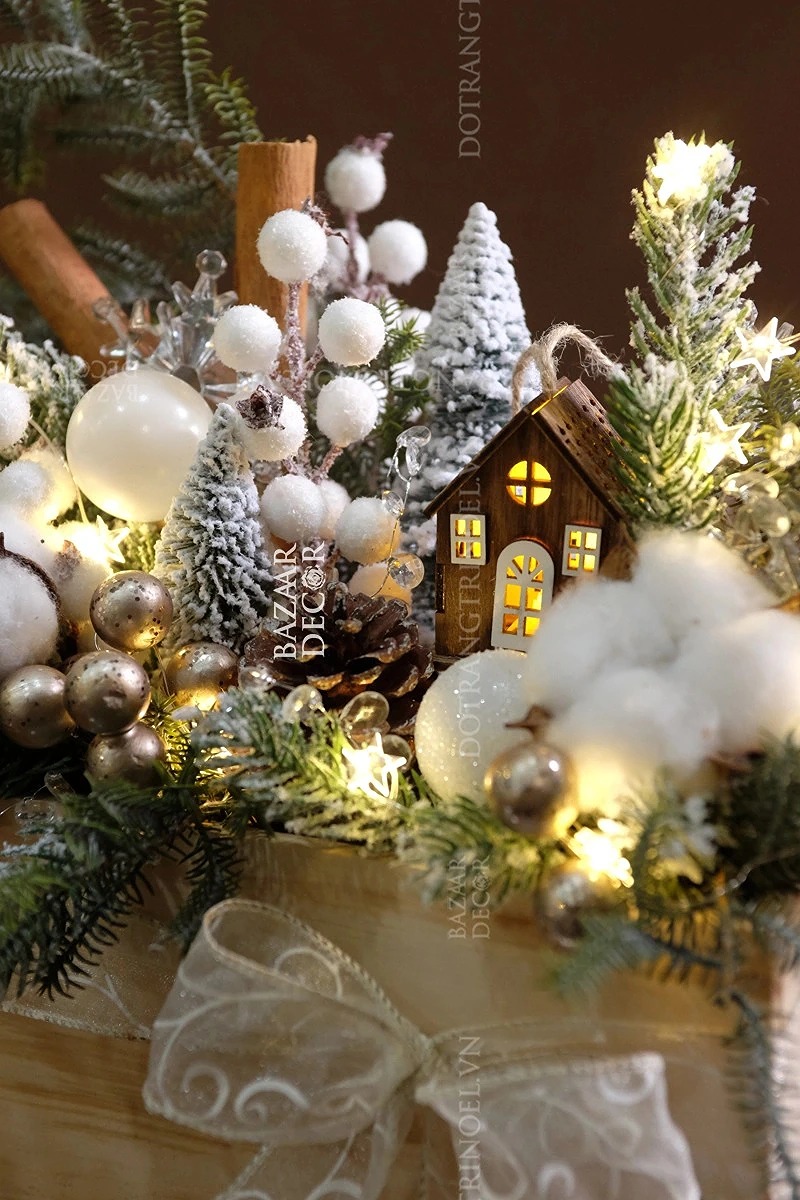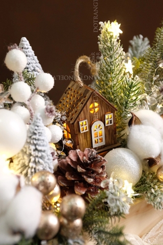 Hãng: BAZACenterpiece khay gỗ Cabin in the Winter - Khu rừng mùa đông phủ tuyết trắng và ngôi nhà gỗ có đèn