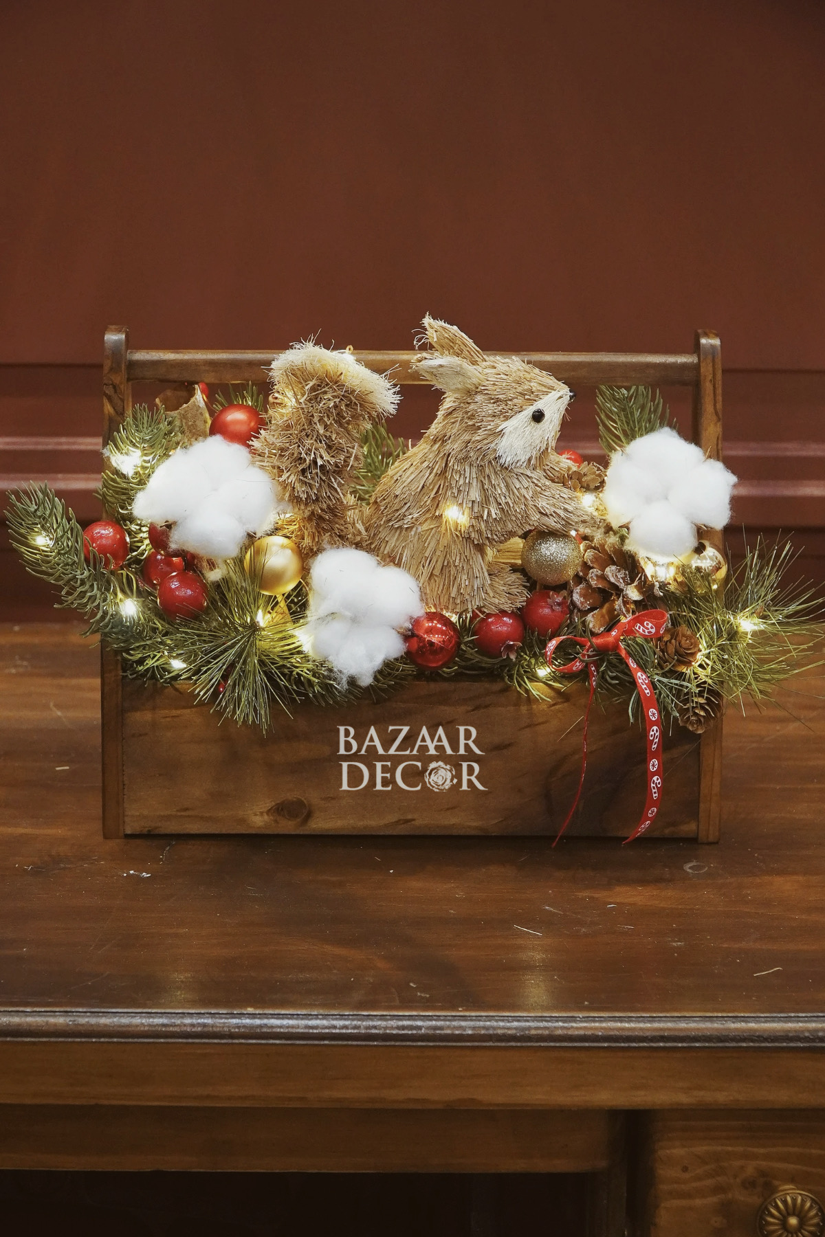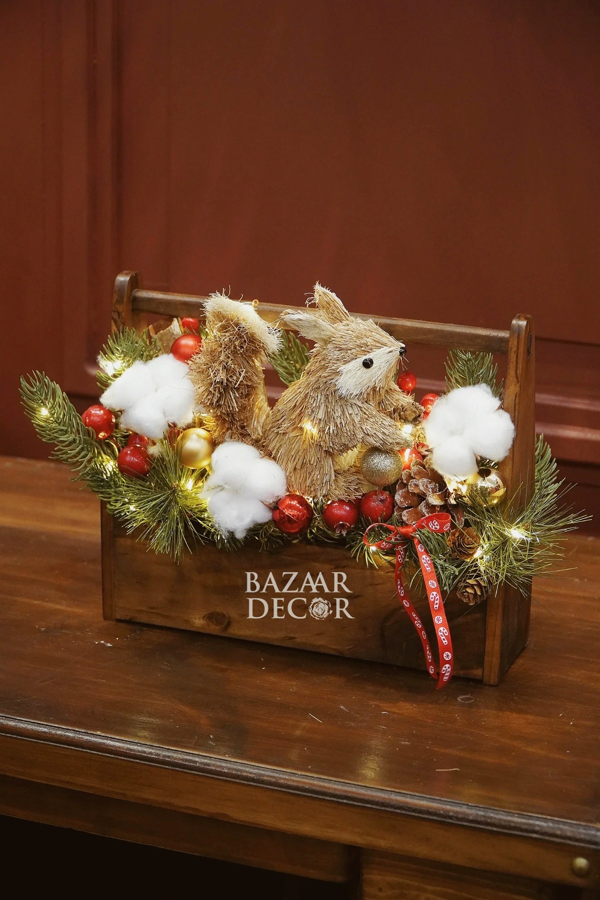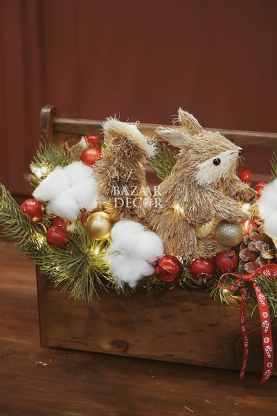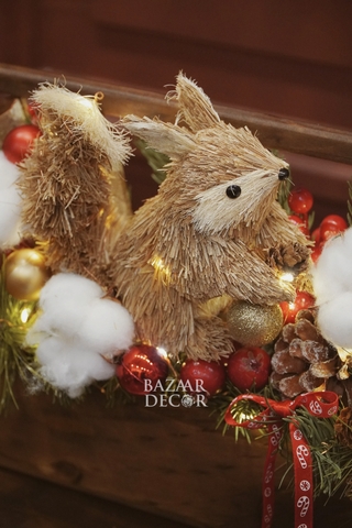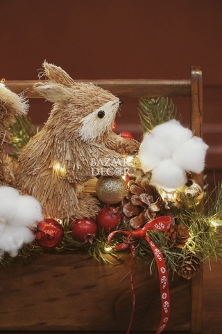 - Khay sóc và bình sóc cắm sẵn: xinh xắn nổi bật với cành thông và quả berry đỏ rực đầy sức sống, nổi bật là chú sóc bằng chất liệu mây tre đan tự nhiên tạo nên khung cảnh lễ hội ấm áp gần gũi đậm chất Vintage.