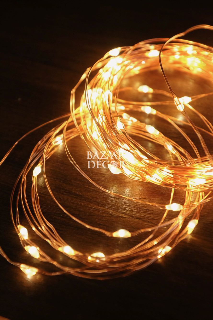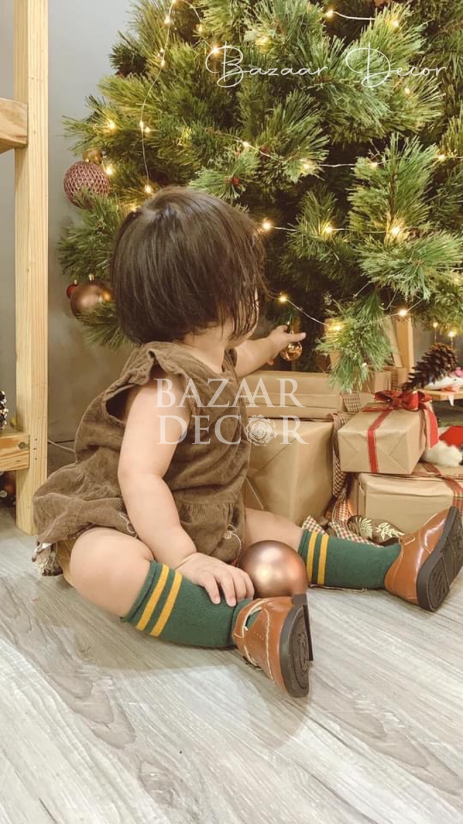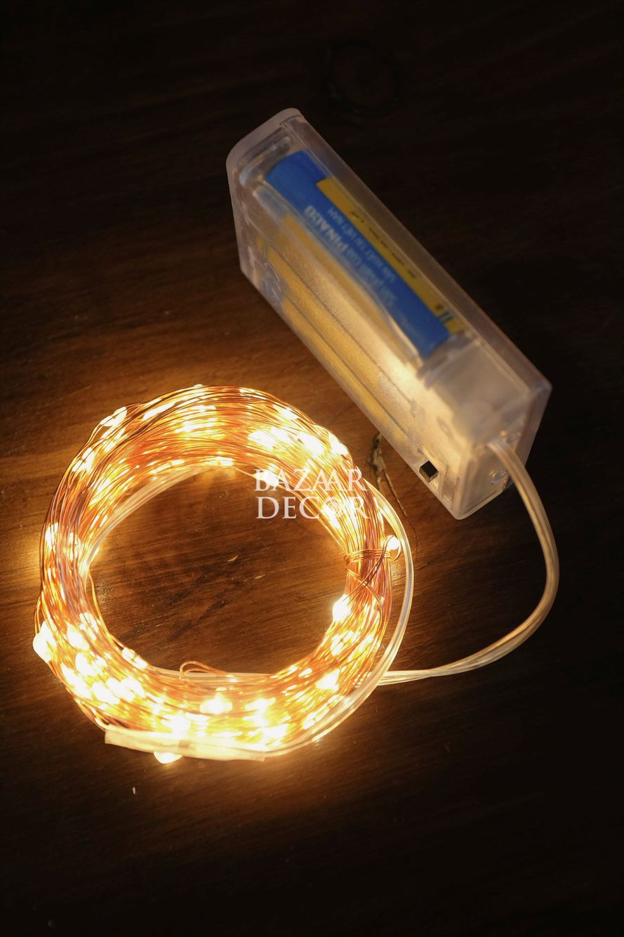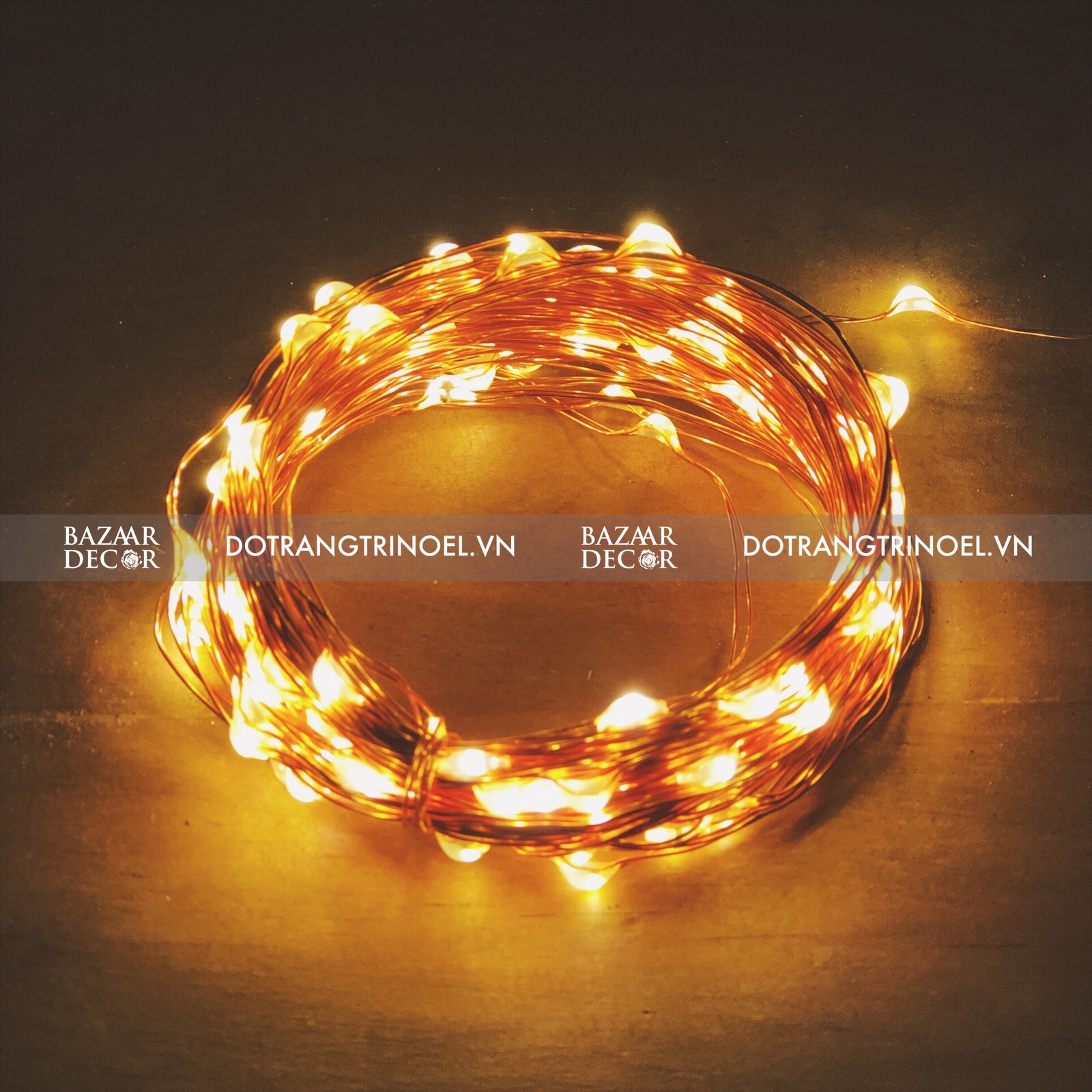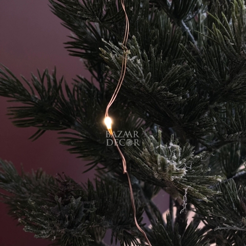 Chất kiệu dây kẽm đồng chắc chắn, ánh sáng vàng ấm áp, chỉ có 1 chế độ luôn sáng không nhấp nháy, ánh sáng vừa phải phù hợp làm ánh sáng nền cho cây thông, kết hợp với đèn pha lê hoặc đèn pháo hoa để cây thông rực rỡ hơn