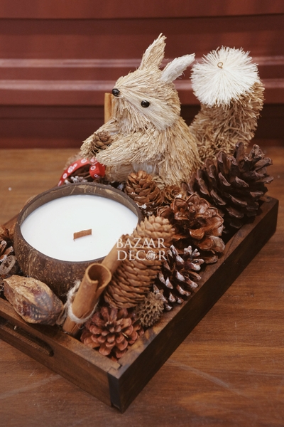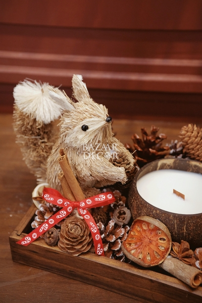 Gồm các loại quả khô, quả thông, khúc cây, quế, chuông đồng... vintage đặt vừa trong khay gỗ, có thể dùng trang trí quầy tính tiền, tủ kệ, bàn làm việc, bàn tiệc… với điểm nhấn là chú sóc tươi vui sinh động ngập tràn không khí lễ hội