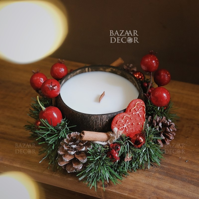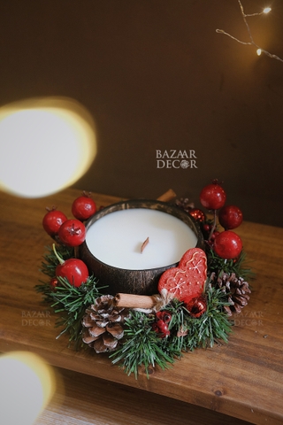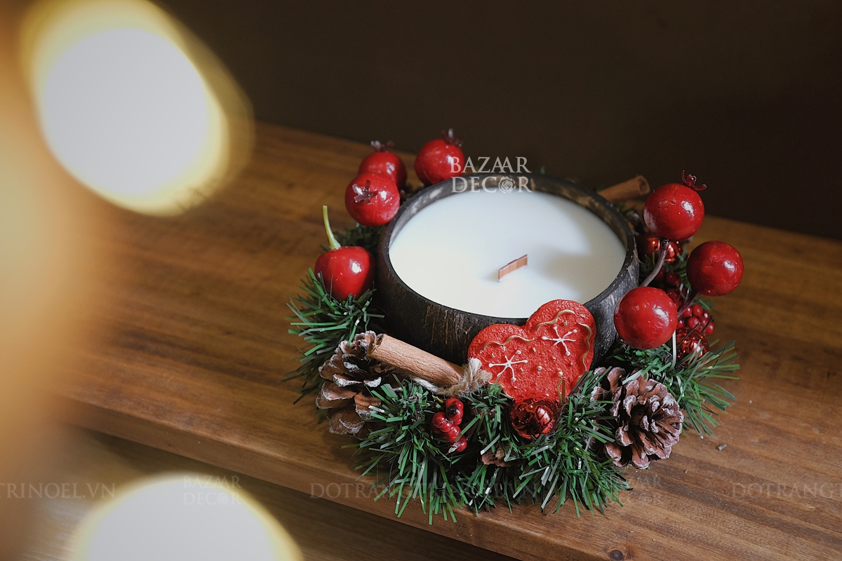 Hãng: BAZAMẫu nến gáo dừa sáp đậu nành được đặt trong vòng lá thông, quả châu và phụ kiện xinh xắn, có hộp quà tặng trong suốt và thắt ruy-băng mang lại cảm giác vừa mộc mạc vừa sang trọng.