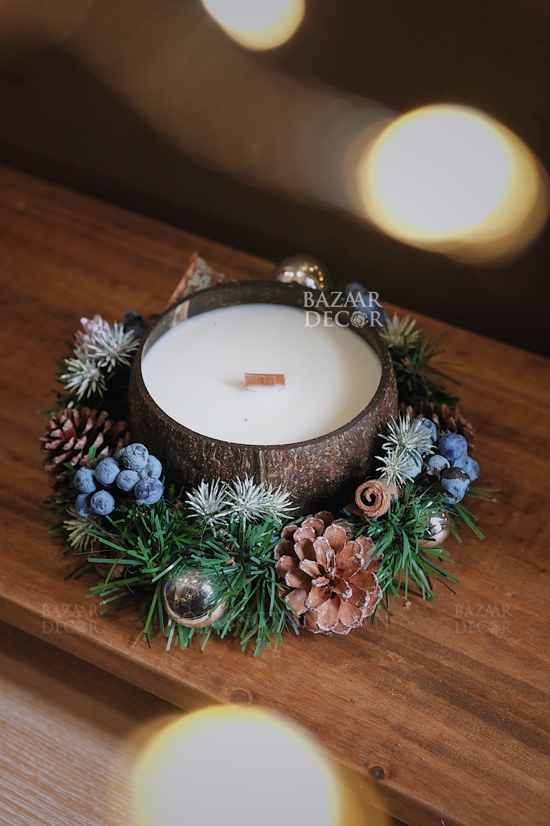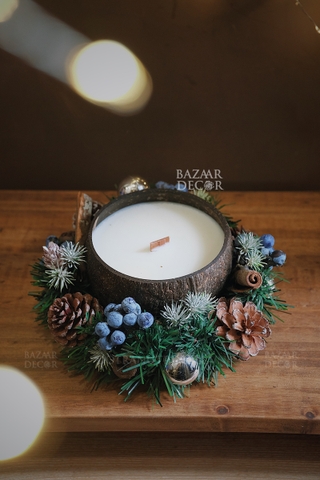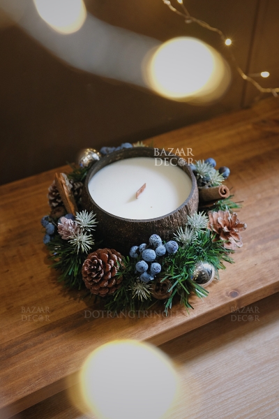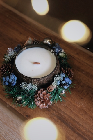 Giao hàng tận nơi trên toàn quốcMẫu nến gáo dừa sáp đậu nành được đặt trong vòng lá thông, quả châu và phụ kiện xinh xắn, có hộp quà tặng trong suốt và thắt ruy-băng mang lại cảm giác vừa mộc mạc vừa sang trọng.