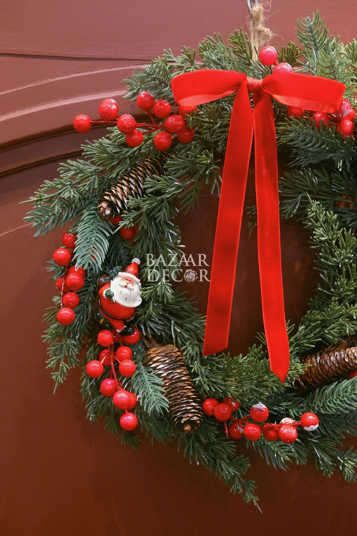 Vòng nguyệt quế xinh xắn với điểm nhấn là hai ông già Noel tượng trưng cho niềm vui và hạnh phúc, gợi lên hình ảnh Giáng Sinh an lành và đong đầy yêu thương. Và chiếc nơ nhung đỏ mềm mại được đặt tinh tế làm tăng thêm nét sang trọng, quý phái