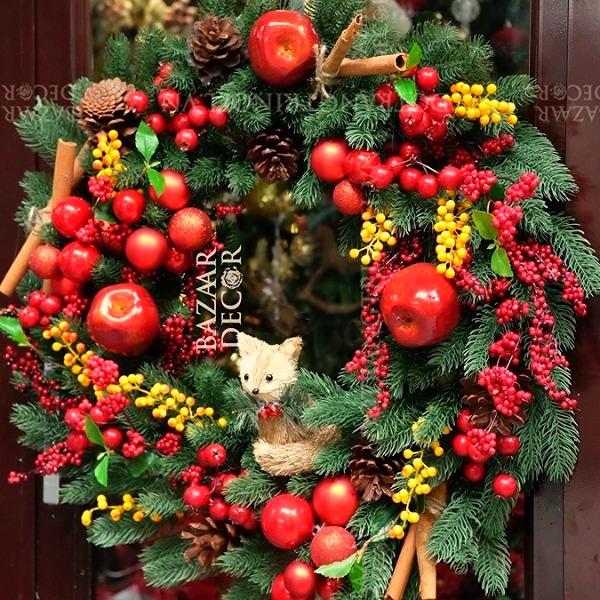 - Dây thông táo & trạng nguyên: màu đỏ rực rỡ của trạng nguyên, táo các loại berry trên nền lá thông mang lại không khí lễ hội tươi vui sinh động thích hợp trang trí không gian cửa, cửa sổ, lan can hoặc bàn ăn.