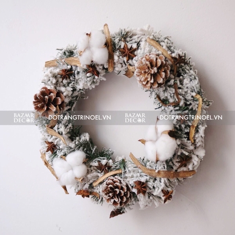 Vòng nguyệt quế Wood Snow Cotton phiên bản giới hạn đường kính khoảng 30cm phù hợp treo tường, cửa kiếng, cửa gỗ... trang trí nhà, cửa hàng, showroom, nhà hàng, quán cafe, homestay, hotels, spa, studio... trang trí tiệc, events...